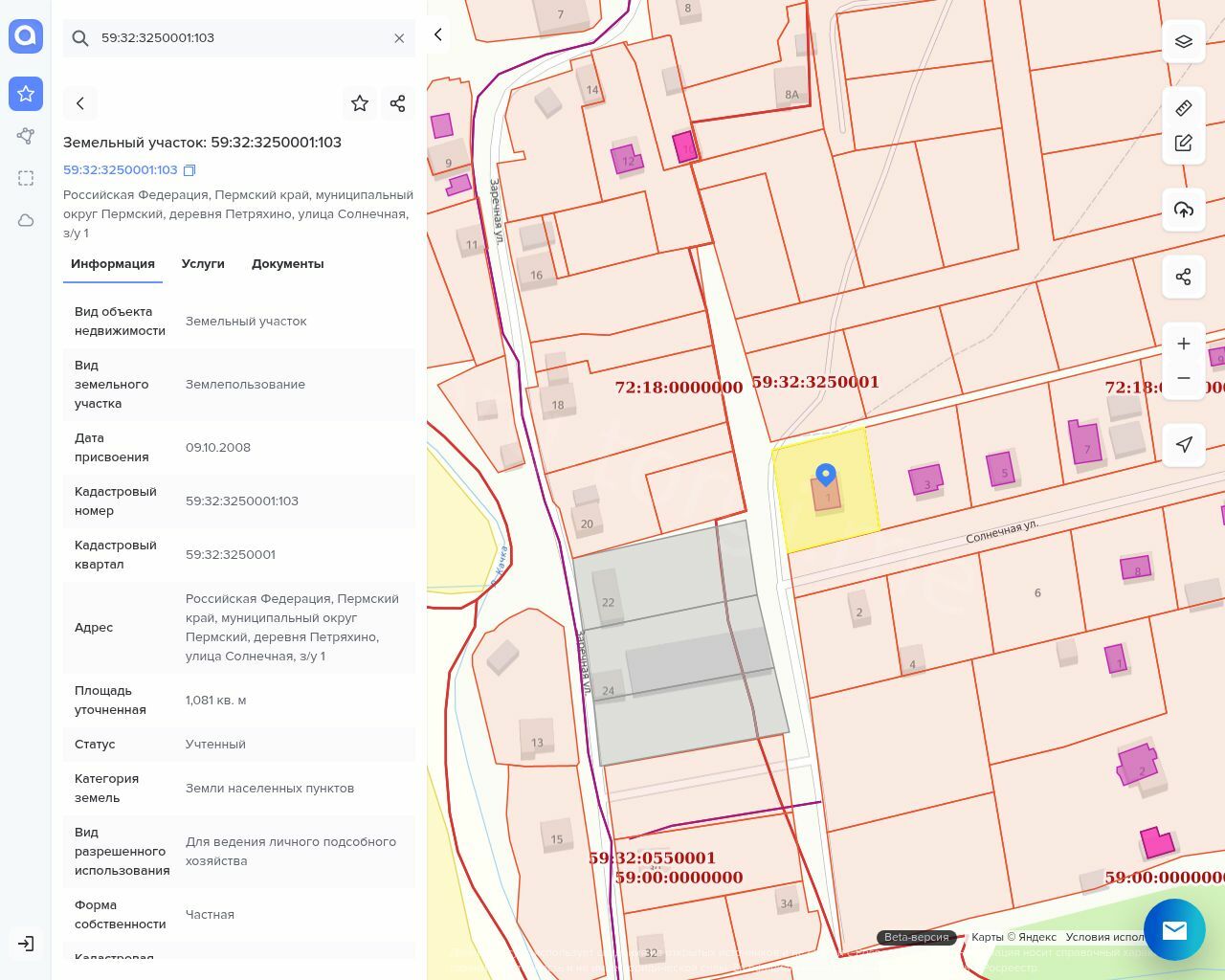 Земельный участок, площадь 1081 кв. м., кадастровый номер 59:32:3250001:103,