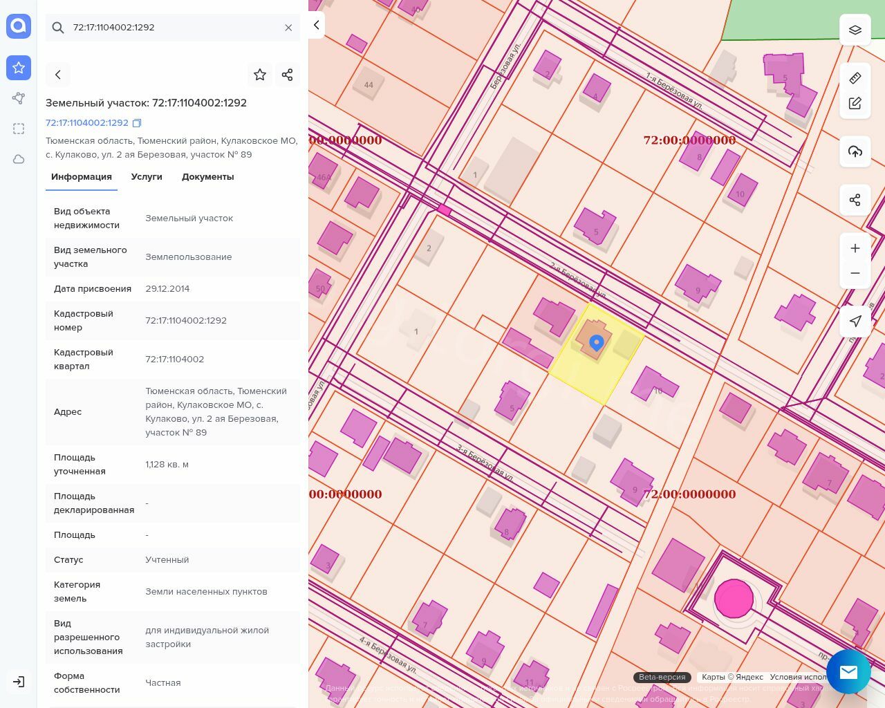Земельный участок площадью 1128 кв.м., кадастровый номер: 72:17:1104002:1292