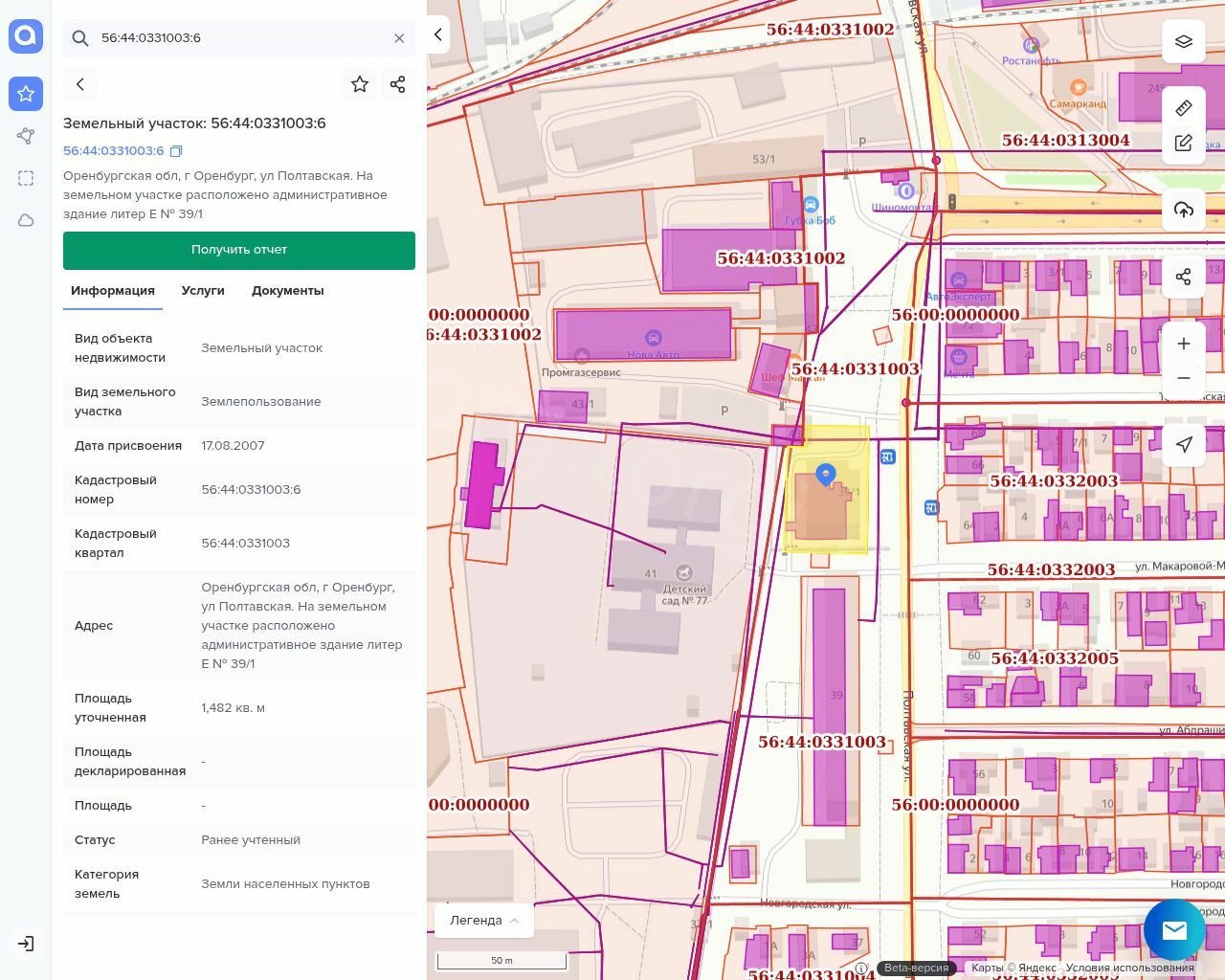 Земельный участок: Вид земельного участка Землепользование, Дата присвоения 17.08.2007, Кадастровый номер 56:44:0331003:6, Кадастровый квартал 56:44:0331003, Площадь уточненная 1 482 кв. м.